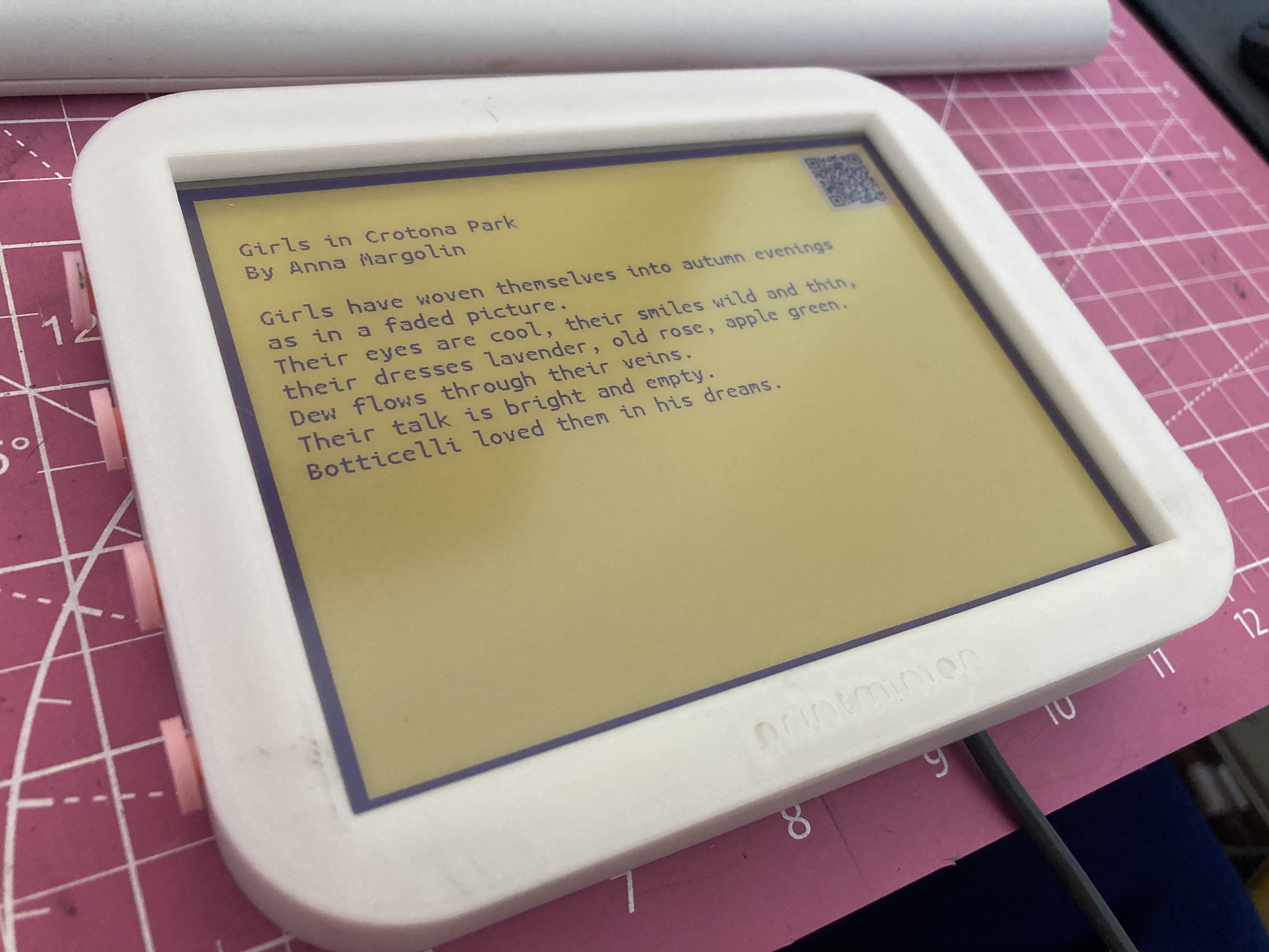 Lastly, I thought, "The poetry site has images and all kind of contextual information. The inky screen is just showing a bare poem on a yellow background." So I added a qr code to the corner of the screen, linking to the respective page of the poetry site. Then I thought, "If I take this to class and want to show it in action, I will have to go into the pi's configs and change the wifi settings..." So I added a preemptory script with preloaded wifi settings from which to select. I have this run on boot.