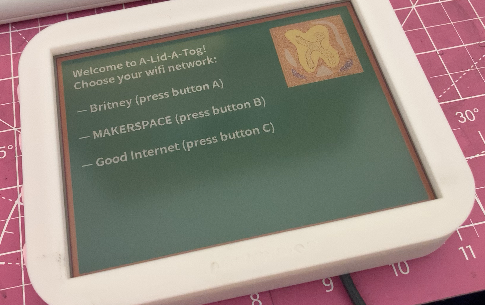 You can download the A-Lid-A-Tog code and the WiFi setup code. Note that they rely on external libraries and config files I have not specified or provided...